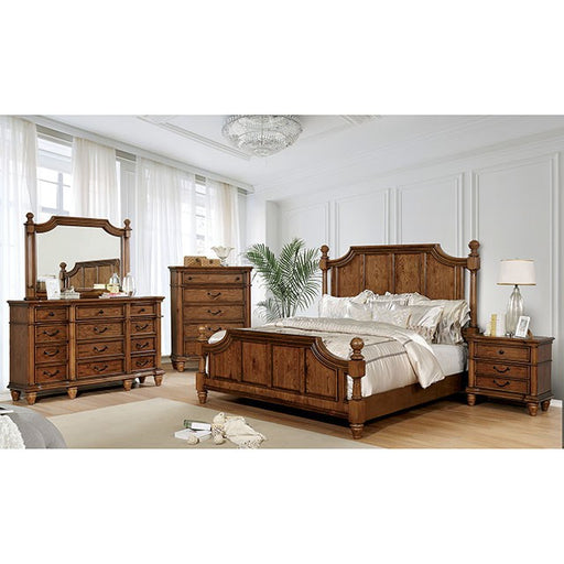 The entire bedroom set is finished with a pronounced wood grain texture, from the massive squared headboard to the base with the rounded corners. T...