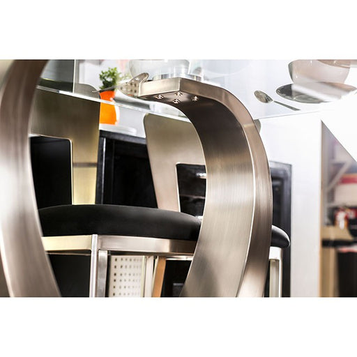 FOA WestNOVA Silver/Black Dining Table, 60"L X 36"W X 30"H, 115.5lbs. Graceful curves durably support the wide, rectangular glass top. The elliptical metal...