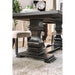 Nerissa Antique Black Dining Table, 84"W X 42"D X 30 1/2"H, 201.52lbs. Enjoy breakfast, lunch and dinner in style and comfort with this stylish dining set! The sophisticated shape of the pedestal pairs perfectly with linen-upholstered chairs and a comfy bench to create a luxurious atmosphere. Scrolled backrests decorate d with button tufts help emanate a regal and feminine style that complements the beautiful antique black color for a chic finishing touch. Features: Rustic Style Trestle Base Chenille Fabric Button Tufted Scrolled Chair Backs Solid Wood, Wood Veneer, Others Antique Black Finish