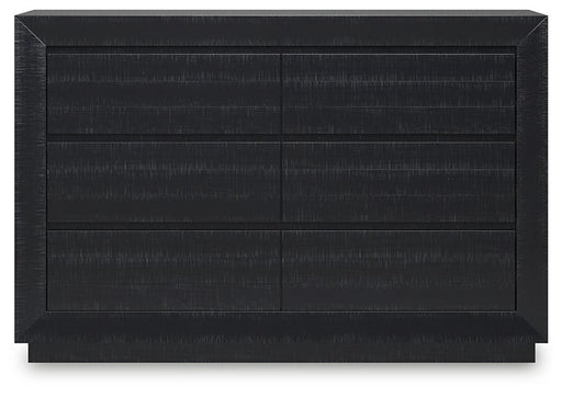 Alzire Black Dresser, 60 7/8"L X 19 5/8"W X 37 3/4"H, 184lbs. Comforting cushioned flannelette encompasses this dresser. Admire the glimmering acry...