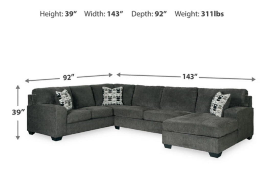 Left facing sofa 92x38x39H, middle loveseat 64x38x39H, chaise 60x39x39H